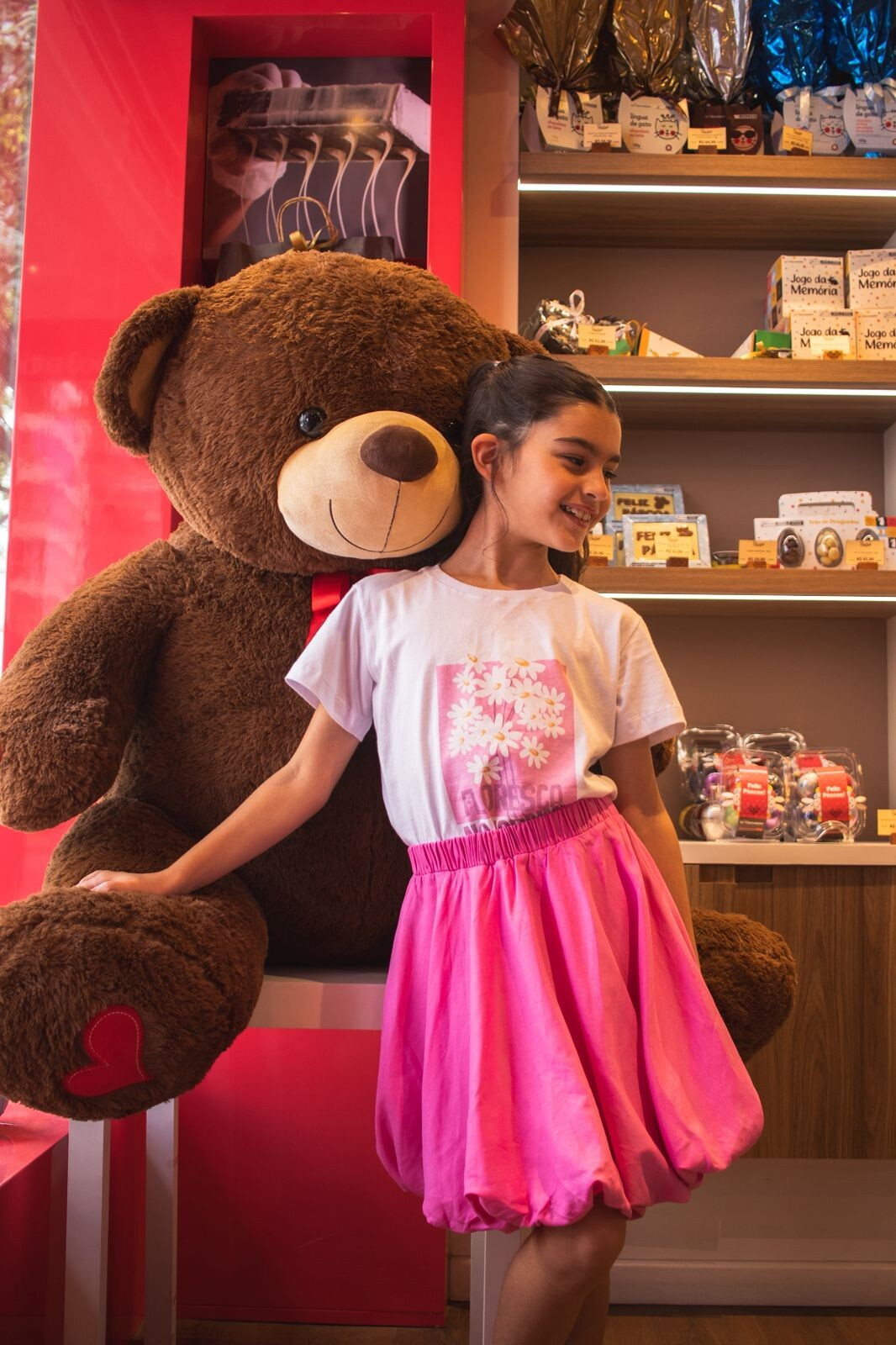 A T-shirt em algodão 100% traz a estampa “Floreça”, transmitindo uma mensagem inspiradora e suave. Já a saia balonê em linho, com forro em voal, garante volume delicado e um caimento estruturado, proporcionando conforto e elegância ao look.