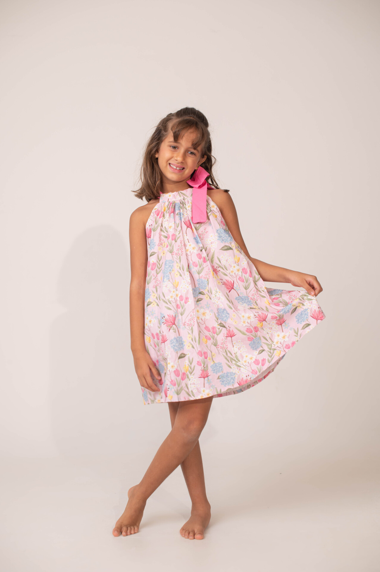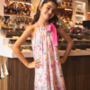 O design conta com amarração no pescoço em formato de laço, proporcionando charme e ajuste confortável, enquanto a modelagem ampla garante liberdade de movimento e o tecido leve oferece um caimento fluido e agradável. Com forro em voal, a peça reforça ainda mais essa leveza, completando o visual com elegância e tornando o vestido perfeito para dias especiais, cheios de afeto e pequenos encantos.