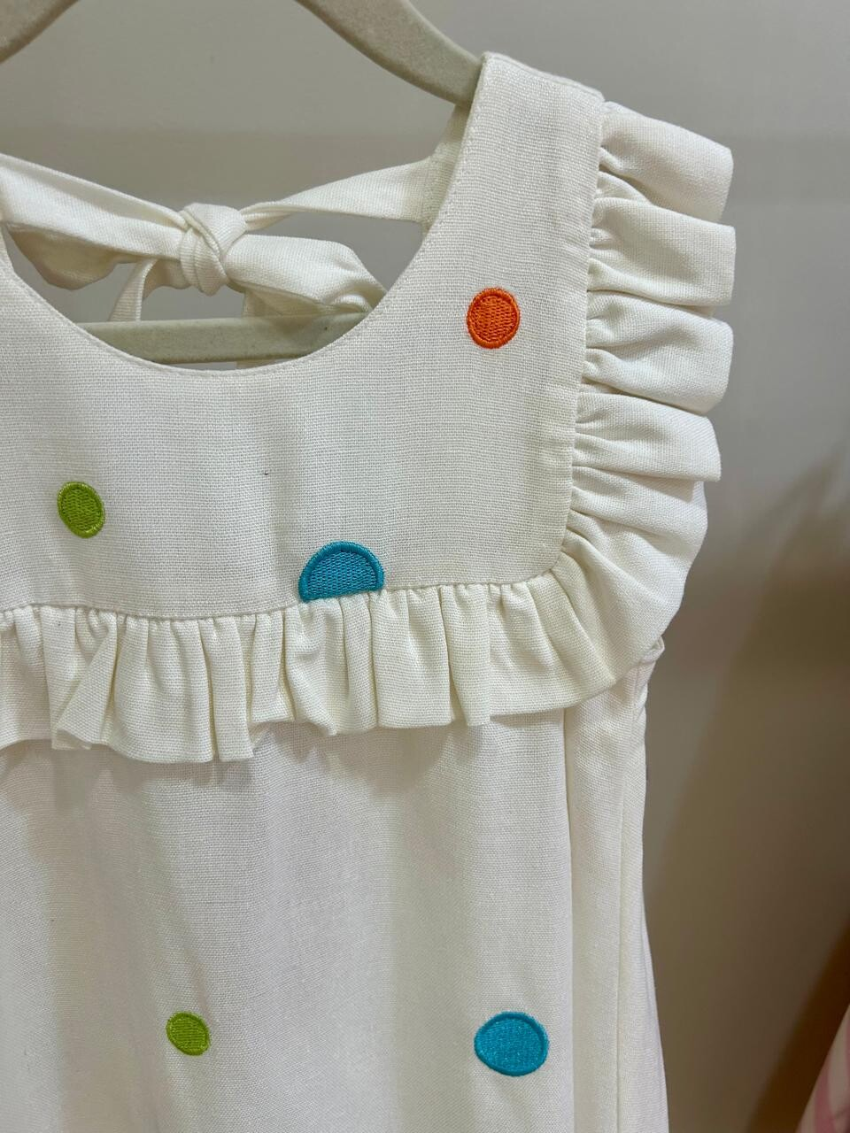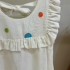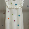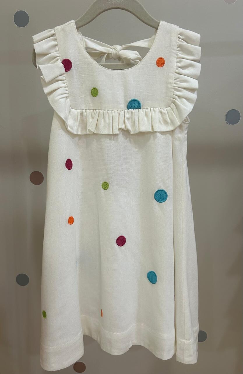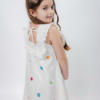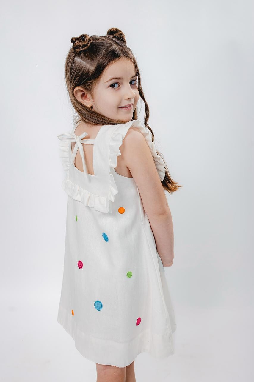 Delicadeza e sofisticação se encontram neste vestido exclusivo confeccionado em linho, tecido nobre que garante caimento impecável e conforto para as pequenas. A peça recebe bordados em formato de bolas coloridas desenvolvidos especialmente para a Coleção Jardim, conferindo charme e autenticidade ao modelo.