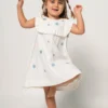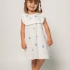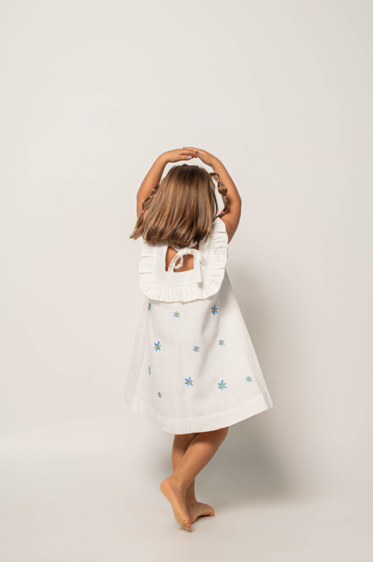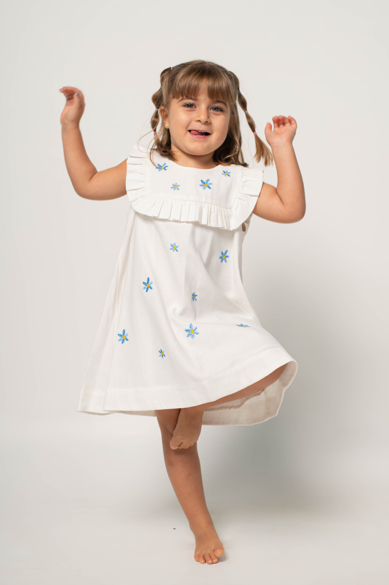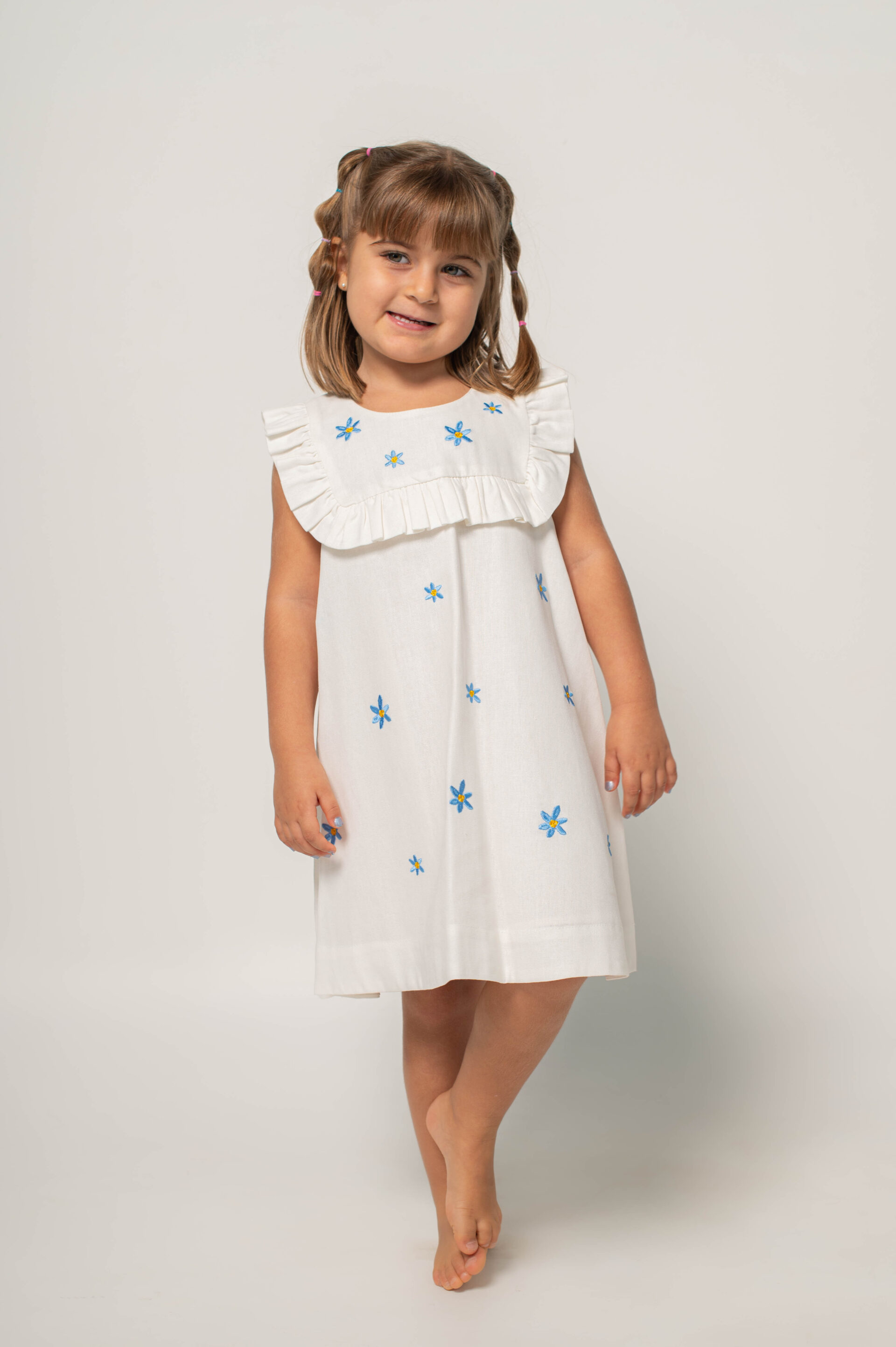 Delicadeza e sofisticação se encontram neste vestido exclusivo confeccionado em linho, tecido nobre que garante caimento impecável e conforto para as pequenas. A peça recebe bordados em formato de flores azuis, desenvolvidos especialmente para a Coleção Jardim, conferindo charme e autenticidade ao modelo.