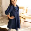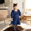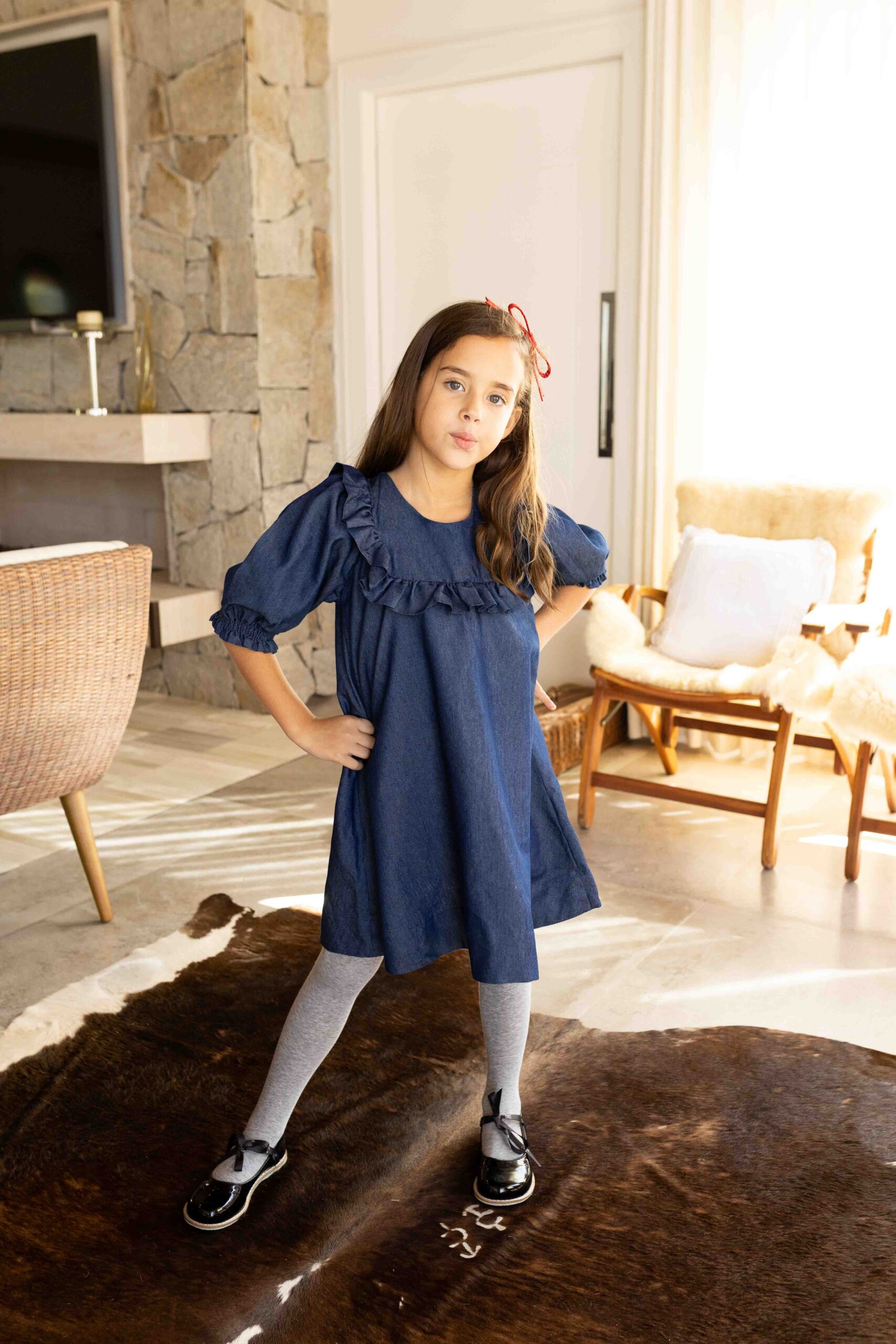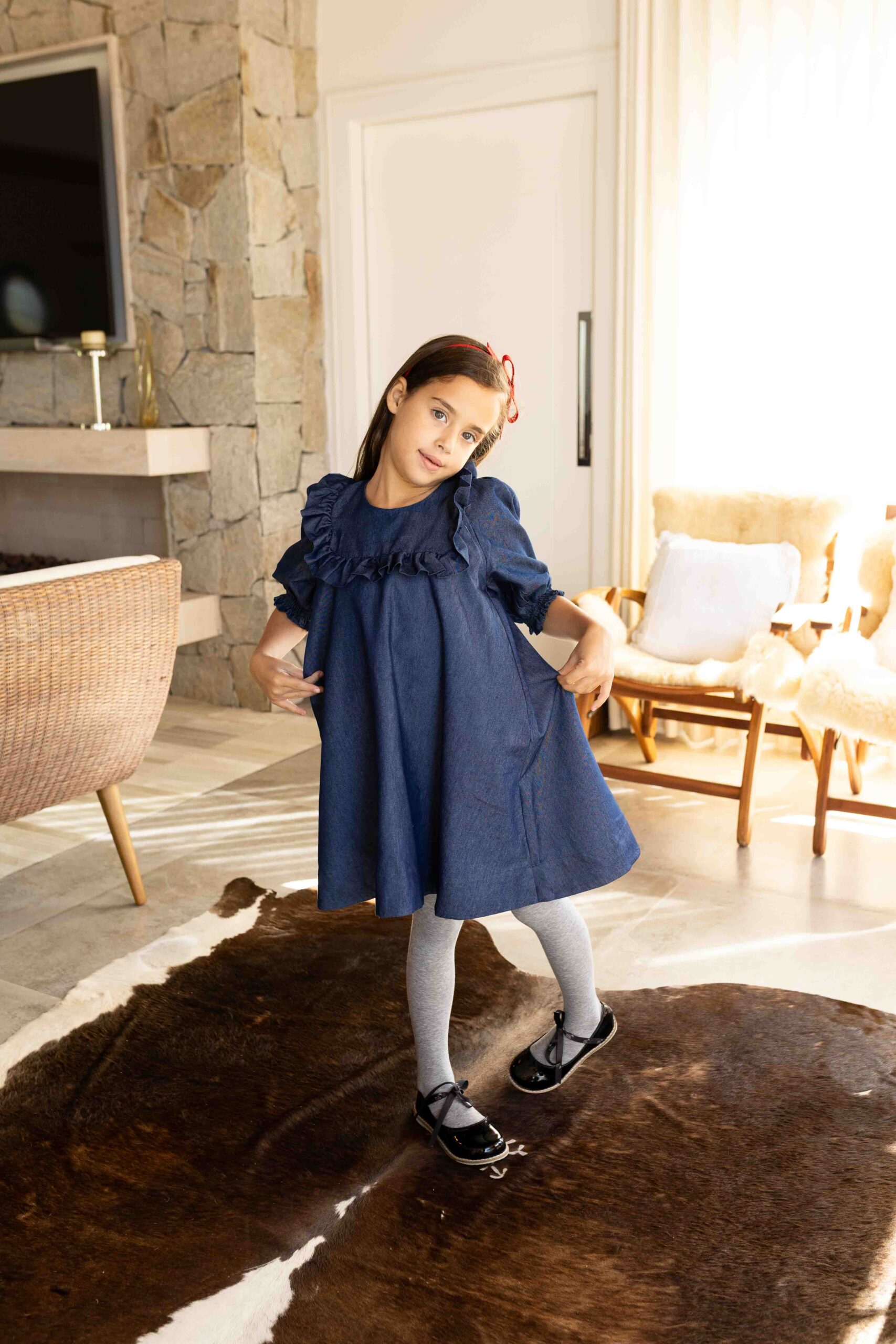 Um clássico repaginado com delicadeza e elegância. Confeccionado em jeans leve, o vestido conta com forro interno e modelagem ampla, proporcionando conforto e liberdade nos movimentos. As mangas 3/4 bufantes e o babado frontal trazem charme à peça, enquanto o ajuste em laço nas costas permite um caimento impecável. Ideal para compor looks estilosos com um toque retrô e moderno ao mesmo tempo.